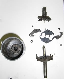 Now with needle nose pliers unhook the weight springs and pull the advance mechanism off the shaft. Another thing I do is put everything in the orientation I pulled it off. Remove the E clips, remove the weights, SUPER carefully remove the washers and finally just as carefully remove the plastic gasket.